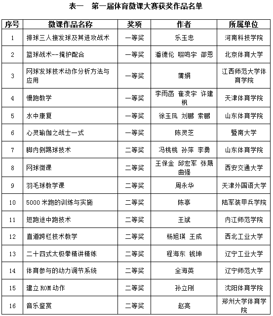 19日下午,进行了第一届体育微课大赛作品展示学术交流活动。体育微课展示活动由暨南大学周红春教授主持,刘玫瑾、周红春、陈善平、王成、刘鹏组成的专家组,对从46个体育微课作品中初选进入复赛的26个作品,逐一进行了现场展示及答辩,最终经过专家严格、认真评选,遴选出体育微课作品一等奖6个,二等奖10个,三等奖30个。(微课作品获奖名单见表一)。体育微课是现代体育教育的重要手段,微课的制作水平直接展现了当今体育教学的水平,本次比赛作品涉及课程种类多,多媒体应用丰富,体现教学设计,涌现出值得借鉴学习的优秀作品。