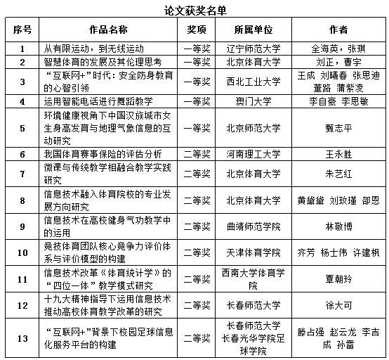 20日上午进行的是论文报告交流,论文报告交流由北京师范大学甄志平教授主持,甄志平、杨龙、崔凤海组成的评审专家组,对26篇论文进行了评奖,论文涉及智慧体育理论研究,体育健康研究,体育教学研究,信息技术研究等多个应用方面,最终,经过现场报告,答辩环节,专家组认真评选,遴选出论文一等奖5篇,二等奖10篇,三等奖11篇。(参会论文列表见表二)